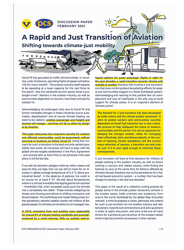 Dieses Diskussionspapier erörtert, wie eine langfristige Sicherheit für die Beschäftigten und betroffene Gruppen gewährleistet werden kann, ohne zum Modell vor Corona zurückzukehren. Dieses Diskussionspapier, das im Februar 2021 vom Stay Grounded Network und der britischen Gewerkschaft PCS veröffentlicht wurde, ist das Ergebnis eines kollektiven Schreibprozesses von Menschen, die in der Klimagerechtigkeitsbewegung aktiv sind, von Beschäftigten im Flugverkehr, Gewerkschaften, indigenen Gemeinschaften und Akademiker*innenn aus der ganzen Welt. Ziel ist es, damit Diskussionen anzuregen und konkrete Übergangspläne von Ländern, Arbeiter*innen und Unternehmen anzustoßen.